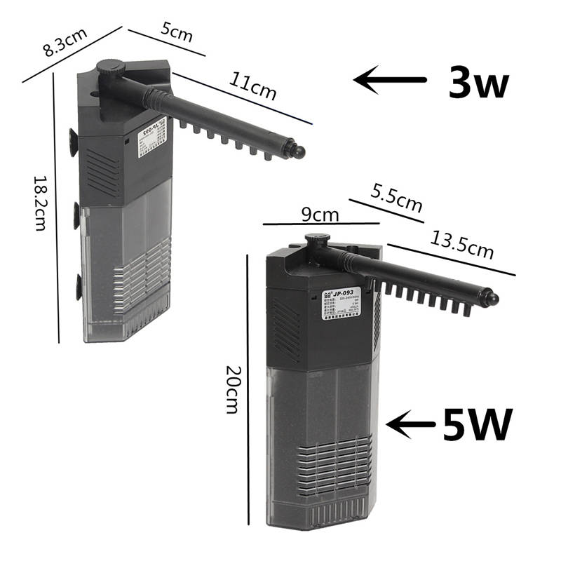 Package Included: 1 x Submersible Filter Pump Specifications:Model: 3W:3W-JP-092 Size: Approx. 18.2x8.3x5cm/ 7.2x3.3x2'' Cable length: 138cm/ 54.3'' Height Max: 0.5m Max Output: 250L/ h Suitable for tanks up to 45 Litres 5W:5W-JP-093, Size: Approx. 20.2x9x5.5cm/ 8x3.5x2.2'' Cable length: Approx.135cm/ 54.1'' Height Max: 0.8m Max Output: 450L/h Suitable for tanks up to 90 Litres Voltage: 220-240V
