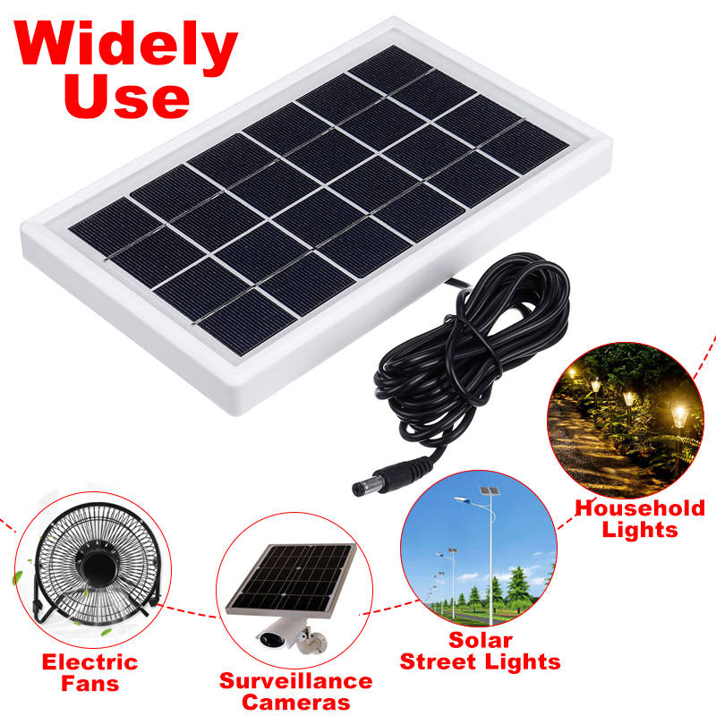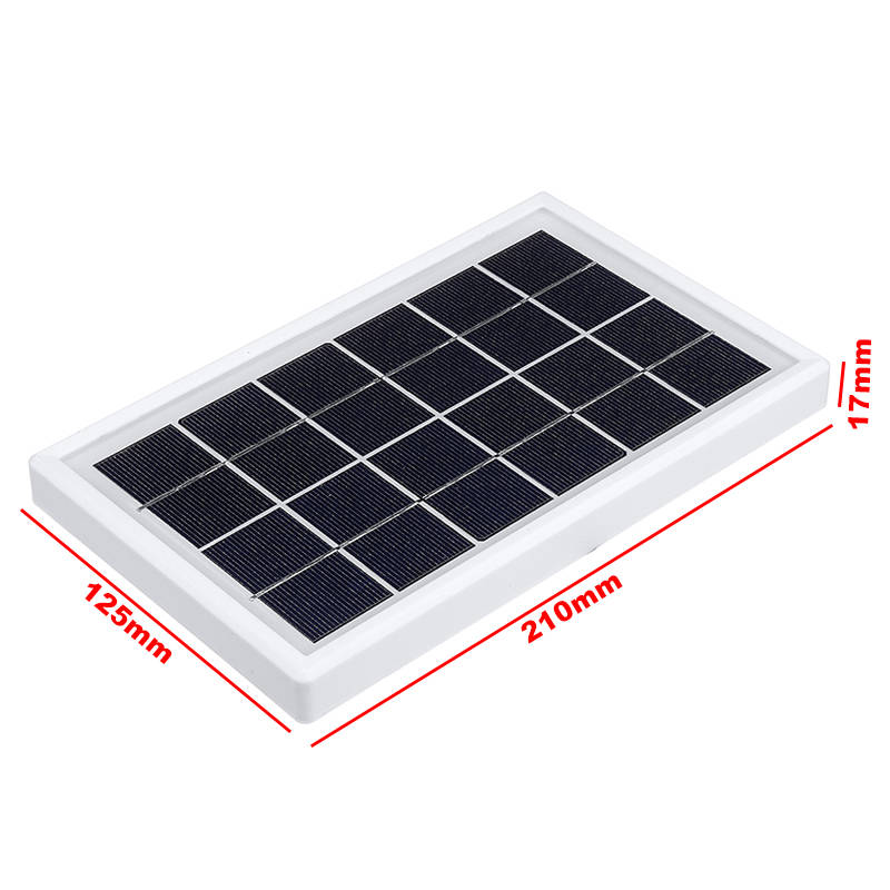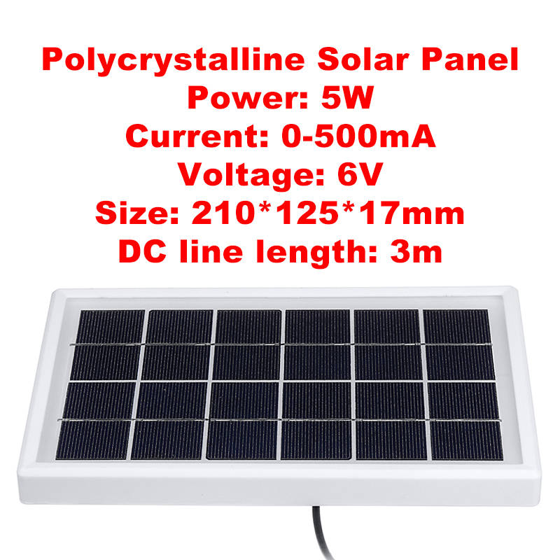 Applications: Suitable for all kinds of low-power appliances, emergency lights, advertising lights, traffic lights, household lights, electric fans, such as, solar water pumps, solar street lights, small solar systems Features: 1) High conversion rate, high efficiency output 2) Excellent low light effect 3) High transmittance and high quality tempered glass 4) Unique process makes the components beautiful and strong, resistant to wind and snow, easy to install 5) Unique technology to avoid freezing and deformation of water in the frame Specifications: Solar panel: 5W Material: Class A polysilicon Current: 0-500mA Voltage: 6V Size: 210*125*17mm Output: DC output Line length: about 3M Package includes: 1 x Solar Panel