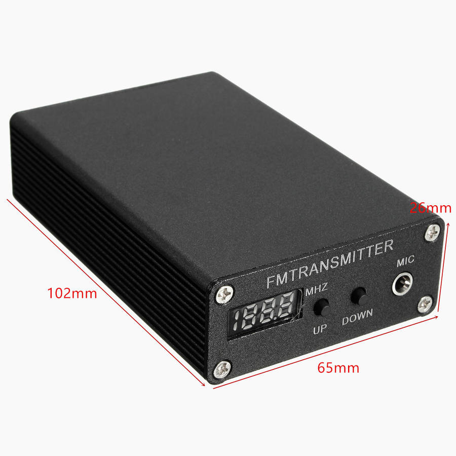 Operation: 1. To connect the antenna and power supply. 2. Short press UP, DOWN key, the transmitter will by 0.1MHz step increase or decrease the working frequency. 3. Press UP, DOWN key, the transmitter will enter a rapid jump, until the key is released. 4. Audio input signals are connected with the "AUDIO" interface, the input string to isolate the front magnetic interference. Note: The default frequency is 87 109M, and can provide other frequency 70 120MHZ 20M bandwidth, open transmission can be more than 5 kilometers. Package includeds : 1 x Transmitter 1 x Adapter (Also come with an adapter according to your country~) 1 x Wire