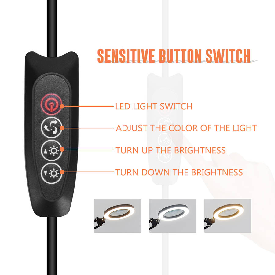 Feature: 1.The durable metal clip can be fixed to any flat surface that is less than 2''/ 5 cm (max) thick. It saves space, conveniently attaches to a desk, workbench. 2.The lamp head can be adjusted 220 ° up and down, and 360 ° swivel. 33cm+33cm/22cm+22cm retractable long arms,180°/135° can be adjusted. 3. Magnifying glass with LED light, the color temperature of LED light can be adjusted in 3 steps and the brightness can be adjusted in 11 steps, it can meet various working environments. 4.Suitable for reading working/ computer boards/ jewelry makers/ arts crafts hobbyists/welding rework/skincare beauty,it can be used universally. Specification: Magnifying Glass Multiple:5X LED Magnifying Glass LED:60 SMD LED Lights Lens Diameter:105mm/4.13'' Dimming: Smooth Dimming; 3 Color Modes DC Adpater: 5V 2A Package including: 1 X Desk Clip Base 1 X Magnifying Glass(Short Handle) Details pictures: ![]() ![]() ![]() ![]() ![]() ![]() ![]() ![]() ![]() ![]() |