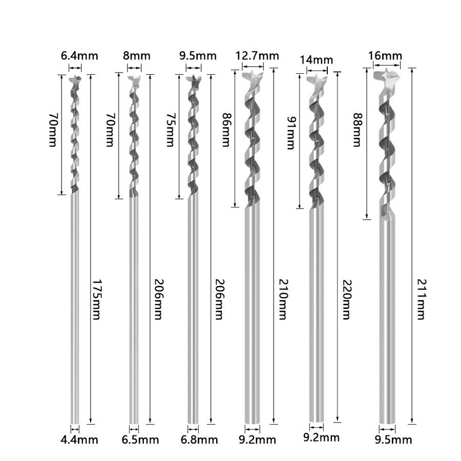 - Type: Tenon plug drill - Material: 45# carbon steel - Size: 6.4mm/8mm/9.5mm/10mm/12.7mm/14mm/16mm - Applications: For professional dowel and screw connection in wood.