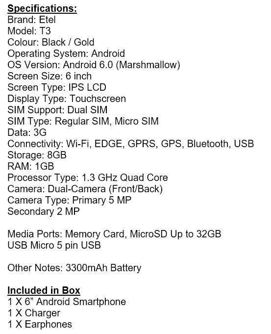6" Android 6.0 Quadcore Smartphone, 8GB, Dual Sim, Dual Camera, 3300mAh Battery, GPS etc.