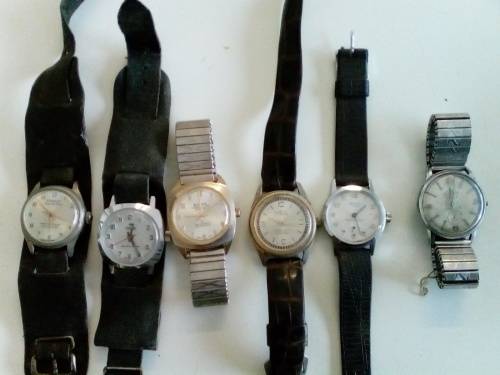 6 antique watches that are not working can be repaired or for parts. from left, romano super deluxe,orion swiss,Roma jeweled swiss,lanco 17 jewelLanco 17 jewel,lanco 17 jewel,Postage will be R60 via sapo within sa