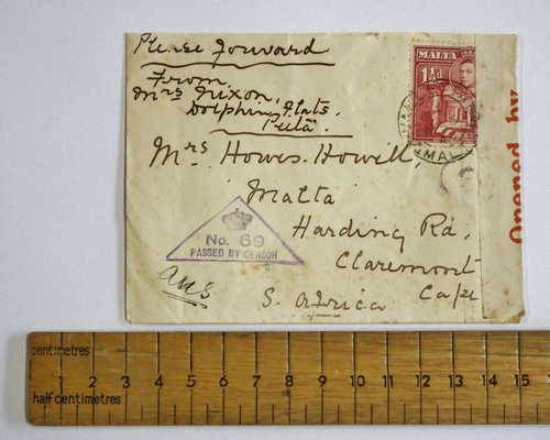 6 April 1940 Censored cover from Valletta, Malta to Claremont, South Africa - Passed by Censor rubber stamp - Opened by Censor sticker & 1 1/2d Malta stamp