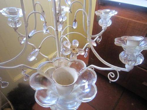 How stunning is this, a metal, glass and crystal (I presume the teardrops are crystal) hanging candle chandeleir in overall very good condition. There are a few missing crystals and one flower has no petals but overall it is lovely and the missing items are not at all noticeable at all and can be replaced easily. I have had this for a long time but have never hung it up so I would rather somebody who will use it more give it a new home. 85cms High and approx 43cms wide. This might be a problem to post because it is so delicate so courier or collection would be better.