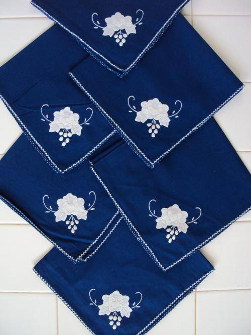 Unique, possibly one of a kind, entirely hand appliqued with white flower design and hand hemmed in a fine white cotton and tiny cross stitches, these cotton royal blue serviettes/place mats are truly a collector's item and heirloom. (strong fabric and expert stitching, they will last for many many years to come). Size 40cmx39cm, excellent vintage condition and unused. Hours and hours of time was spent in the making of these stunning items. Postage R26 please.