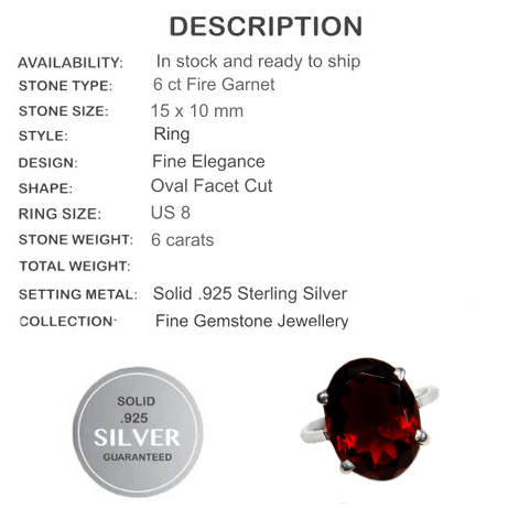 6 CT FIRE GARNET SOLID .925 STERLING SILVER RING SIZE 8