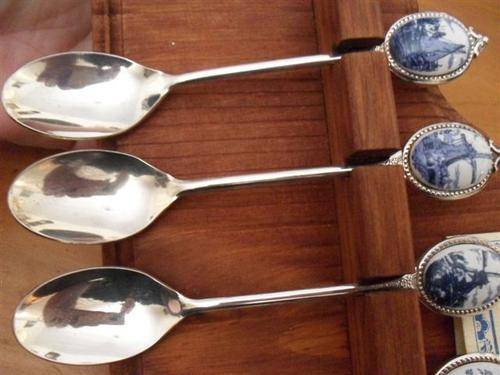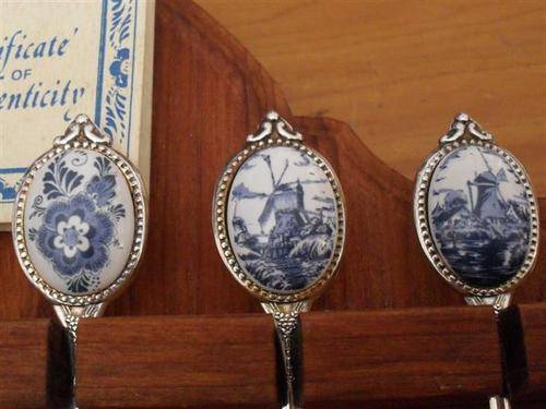 6 DELFT TEASPOONS ON A WOODEN DISPLAY RACK