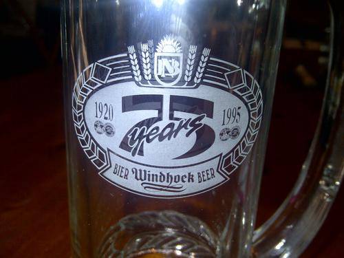 6 tall beer glasses/tankards no chips or cracks, beautiful condition. Rare item, a must for any bar collector. Windhoek Beer 75th anniversary. Solid heavy beer glasses.