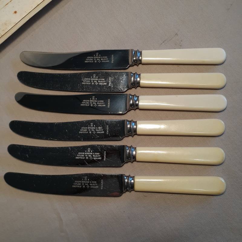 6 Stainless Steel Joseph Rogers Desert Table Knives. I don't think are in their original box. The handles appear to be bakelite/plastic? Don't think they are ivory or bone. Showing little to no wear. The handles on the knives are not all exactly the same colour. Dont hesitate to ask any questions. You are welcome to combine items.