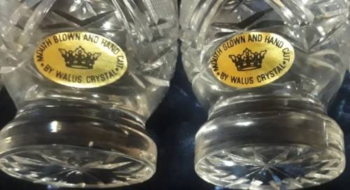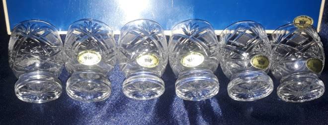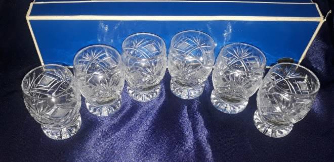 These six mouth-blown hand cut chrystal Walus glasses are in a good condition with no chips or cracks. They are still in the original packaging. Five of the six glasses still have golden stickers with the logo on. The top part of the box is torn on one side.
