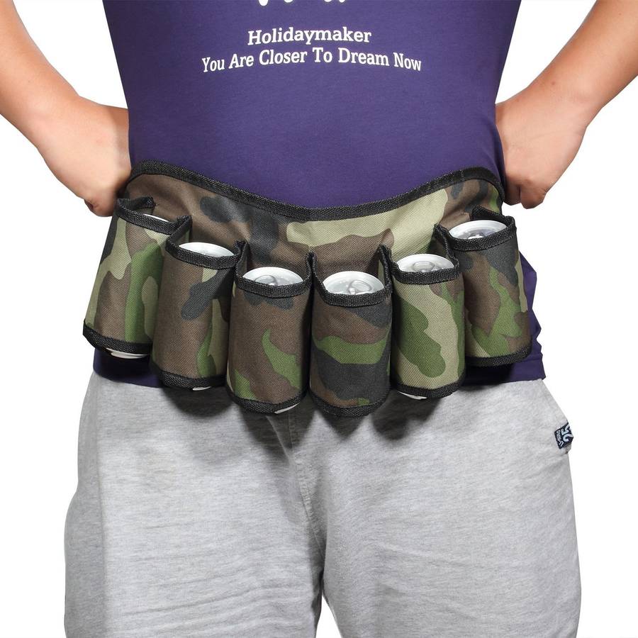 Holds 6 bottles/beers : Be the proud owner of the sexiest six-pack at that Superbowl party with liquid gold on your hips, without hitting the gym. Adjustable up to 54-inches : So even if youave been guzzling down pints for years, your beer belly wonat feel strapped down. Thereall always be room for more beer. Camouflage design : Weave decked it in serious outdoor military style, so whether itas a camping trip with your buddies in the wilderness, or that outdoor barbeque, this beer holder will be your best weapon. Quick-snap buckle : Easily click it on and off whether youare at a sporting event, or handing out drinks at a bar. Itas a click thatas bound to put a smile on everyoneas faces. Soft durable fabric construction: Made of high-quality nylon, this beverage holder frees you up to enjoy the party, with 6 beverage cans snugly fitted on your hips. Specification :