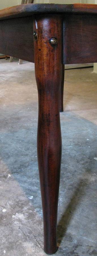 Exquisite example of a globe table with a typical dark undercarriage and solid oregon pine table top The table top has a few marks (see detailed pics) which blend in quite well with the grain of the wood. The top is made from tongue and groove planks and some of the grooves are visible. It is not entirely flush; the one side is about 1 cm lower. Everything is original and intact. The table is very sturdy and suitable for everyday use. Size 76cm high, 1.5m wide, 91cm deep.