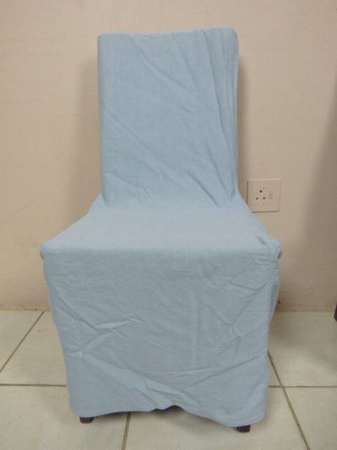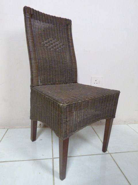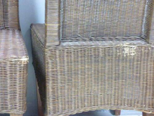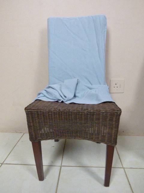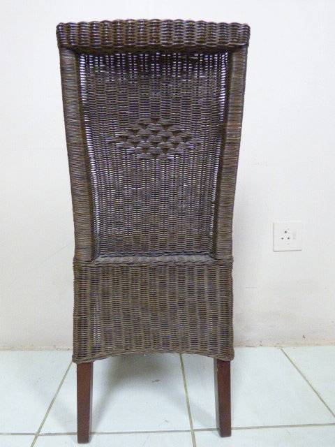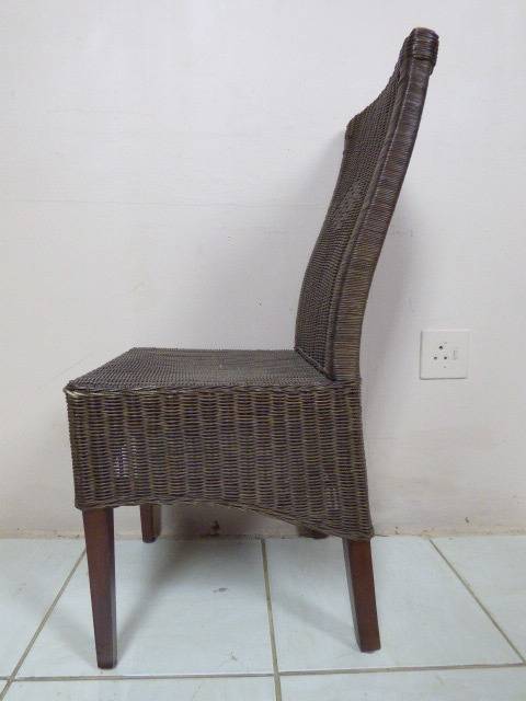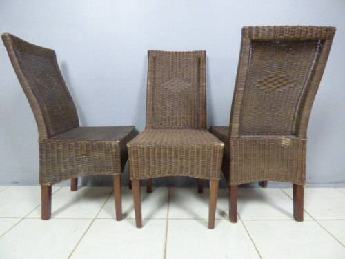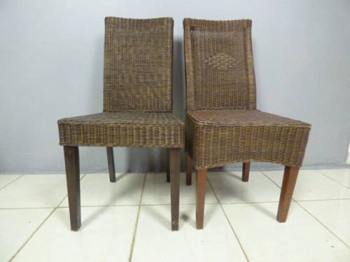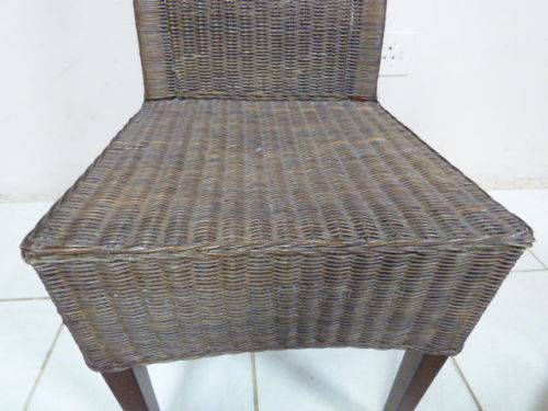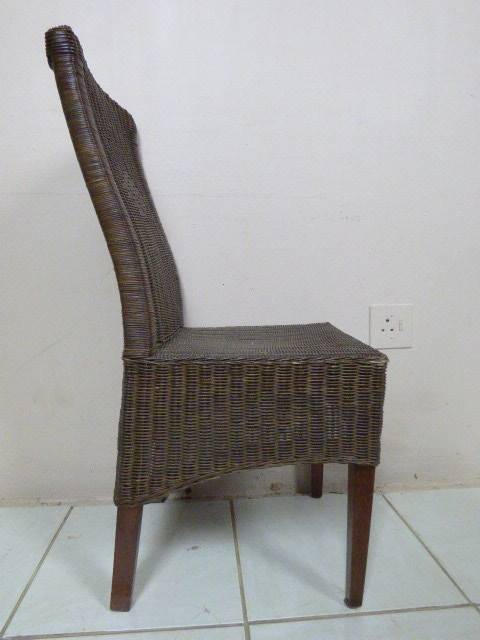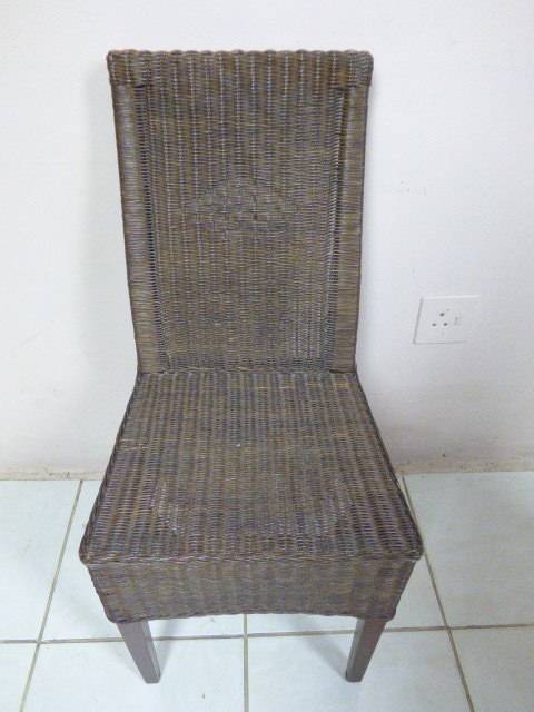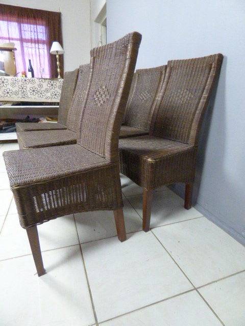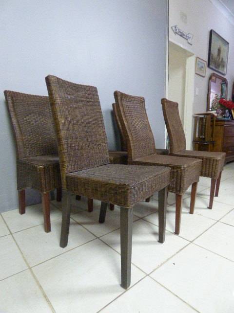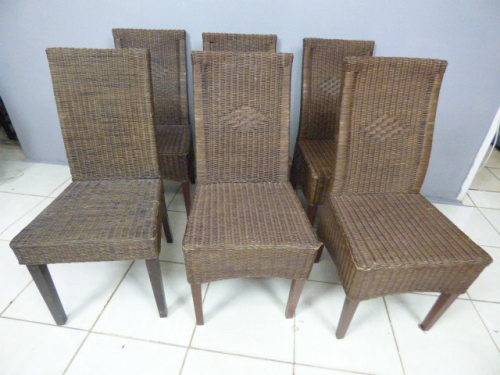 SIX WONDERFUL (ALL-WEATHER RATTAN) OUTDOOR CHAIRS. THESE CHAIRS ARE WELL MADE BUT DO HAVE SOME USAGE RELATED WEAR AND TEAR (PLEASE SEE PICS). THEY ALL HAVE A MATERIAL SLIPCOVER TO PROTECT THEM. PLEASE NOTE THERE ARE NO CUSHIONS. EACH CHAIR MEASURES APPROXIMATELY 42cm x 48cm x 97cm HIGH. LOVELY FOR THAT EXTRA SEATING WHEN FRIENDS OR FAMILY COME OVER. 5 CHAIRS ARE THE SAME AND ONE SLIGHTLY DIFFERS.