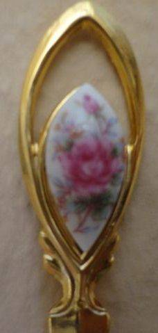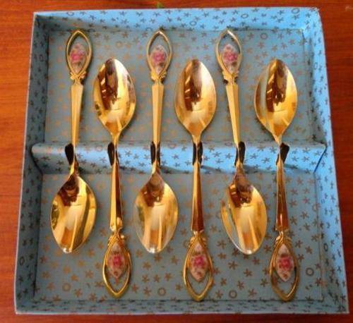 BOXED SETS OF GOLD PLATED TESPOONS AND CAKE FORKS WITH A PORCELAIN INSET DEPICTING A PINK ROSE