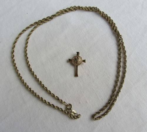 PLEASE NOTE THE BUY IT NOW OPTION~INSTANT PURCHASE AT BARGAIN PRICE!!! Lovely Long 60 cm Solid 9 carat Gold neck chain (LINK STAMPED 375) in a rope style design, together with a solid Antique Gothic Style Cross Pendant in solid 14 carat gold. Combined weight approximately 7.6 grams. Length of Cross about 23 mm long. Value approximately R5500+ Buy It Now price practically scrap!!!!!!WHAT AN INVESTMENT WOW!!!!!!