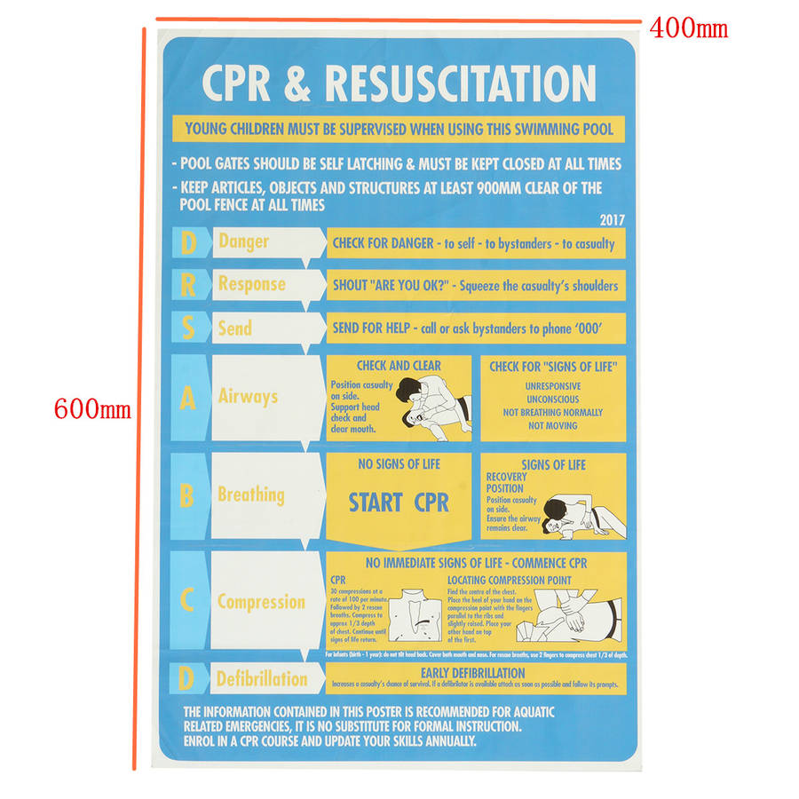 600x400mm Plastic CPR & Resuscitation Chart DRSABC Pool Spa Safety Sign Wall Sticker 600x400mm Plastic CPR & Resuscitation Chart DRSABC Pool Spa Safety Sign Wall Sticker