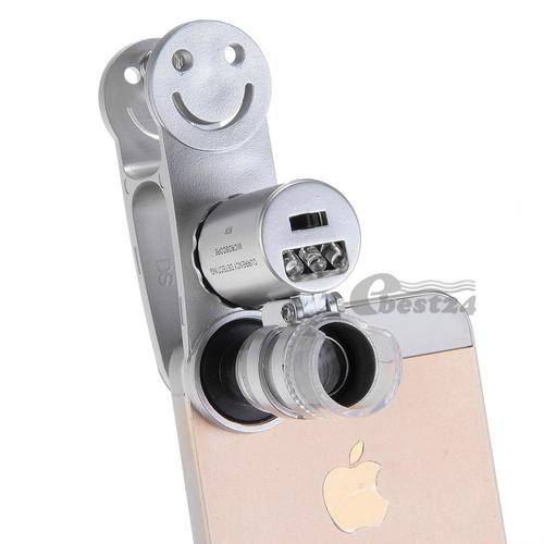 Name: phone microscope with universal clip Color: silver Material: plexiglass ( optical glass ) Lens head/ clip: aluminum Lens cap: ABS Dimension: about 40 x 38 x 19 mm Fits for universal phones Instruction: LED light: 3 ( 2 white light, 1 blue light ) Power supply: built-in 3 LR1130 cell battery |