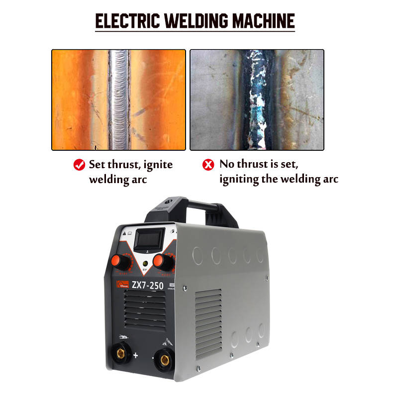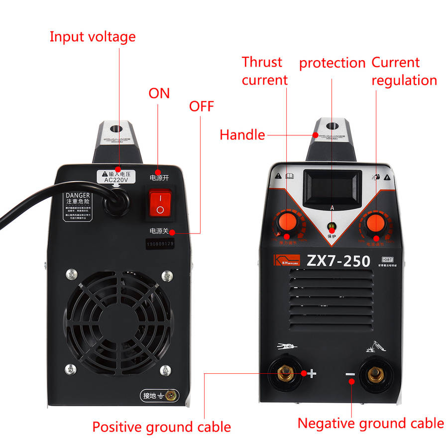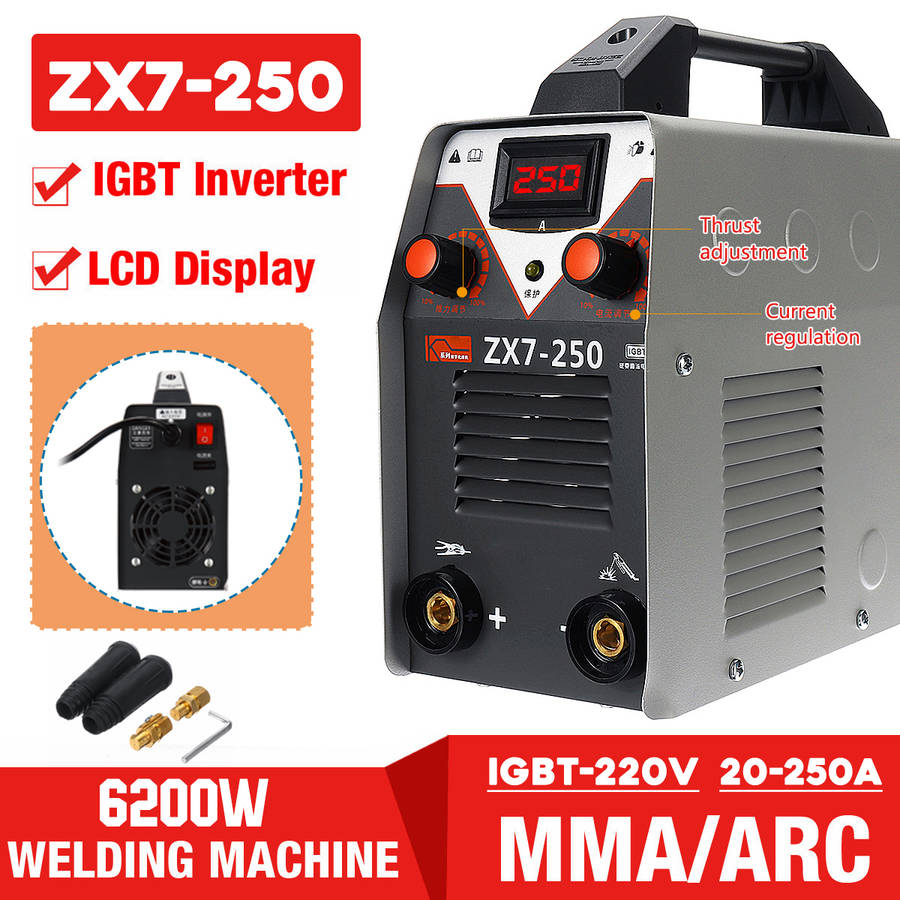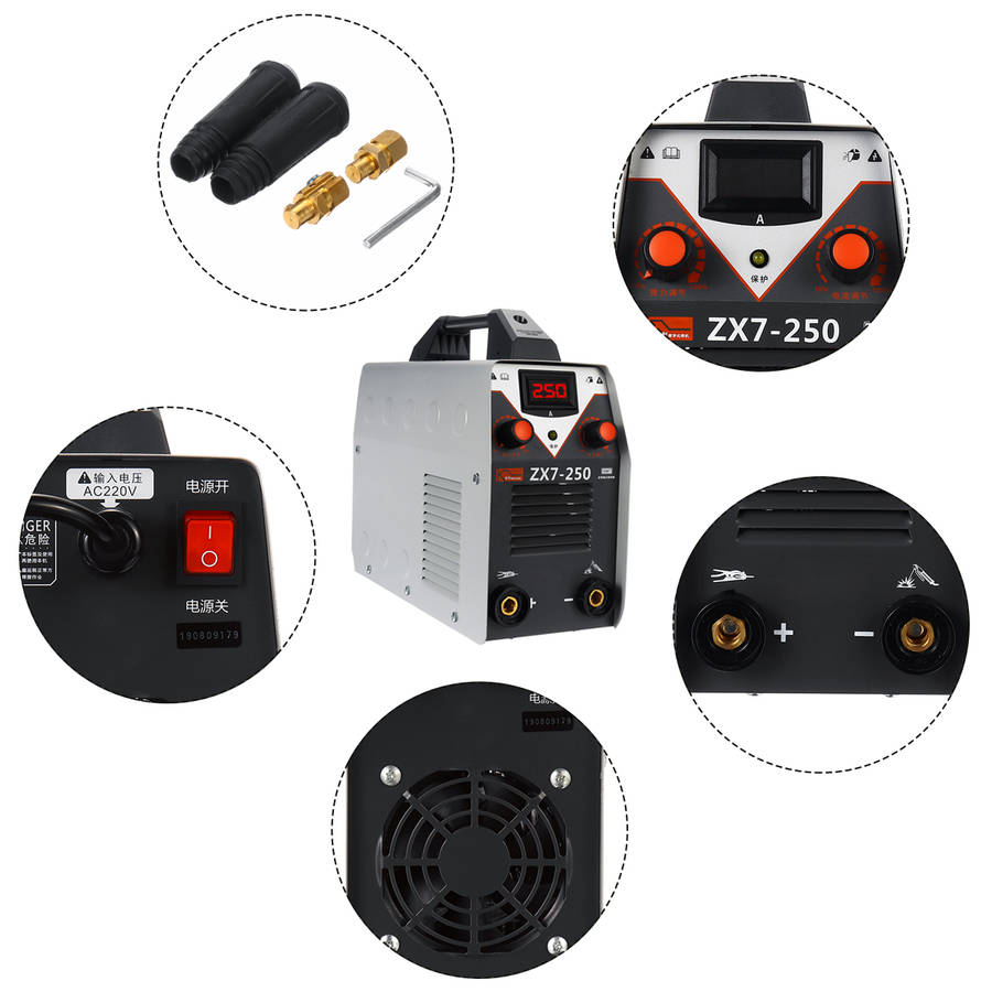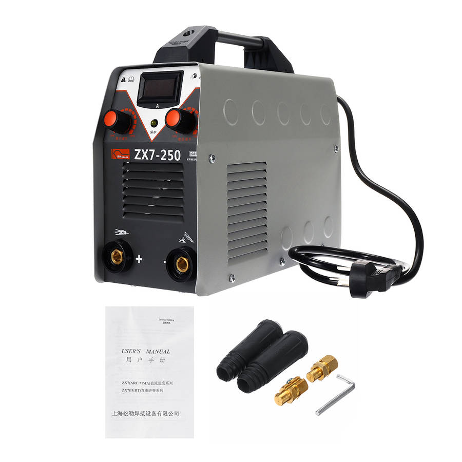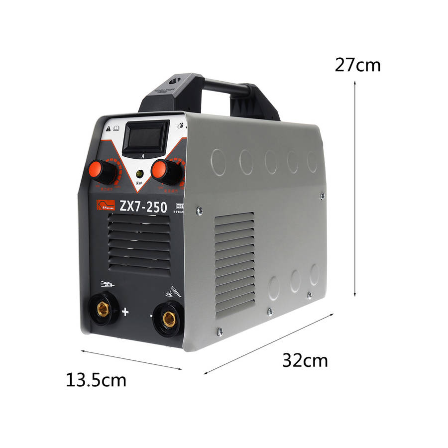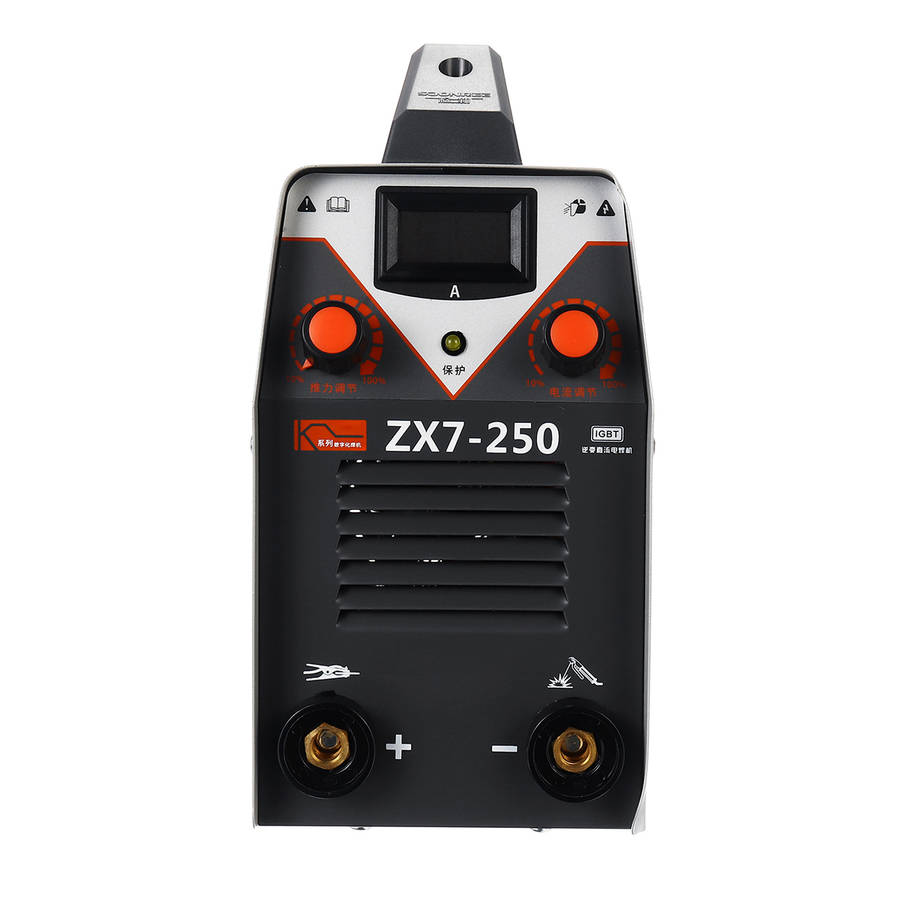Digital display, allows adjusting output current ranging from 20 to 250A. Thrust adjustment and current regulation. Hot start, increases the output amperage at arc start to eliminate sticking of the electrode. Advanced IGBT inverter technology, features excellent arc stability and less spatter. High welding efficiency, 60% duty cycle, ensures long time welding. High quality plastic handle, easy to carry out. Overcurrent and overheat, double protection. Heat dissipation shutters, effectively promote the heat dissipation of machinery. Fully automatic DC voltage stabilized welding machine. Pure copper welding wire, enough power. Provide a stronger, more stable and more concentrated arc.