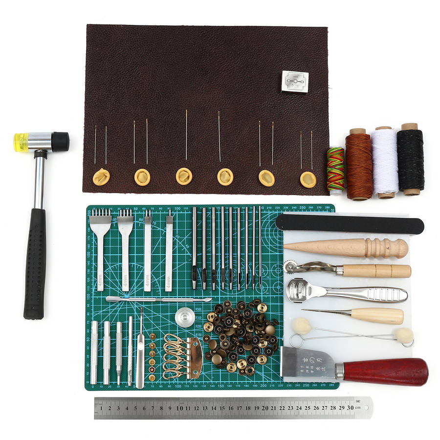 150D 50m wax line: 3pcs (white + black + coffee) 100m rainbow sewing thread: 1pc Sanding sand: 1pc polished round bar: 1pc 2cm round wooden handle marking wheel: 1pc Thinning knife: 1pc Thinning blade: 10pcs Wool ball: 2pcs Knife: 1pc Log cone: 1pc A4 cutting board: 1pc Glue stick: 1pc 95mm V type trencher: 1pc 4mm 1-6 tooth spacing: 1 set Round punch: 1 set Wafer: 1pc 633 tools: 1 set Rivet tool: 1 set Key row: 1pc Four-button combination: 20 set 30cm steel ruler: 1pc White pad: 1pc Finger sleeve: 6pcs Hammer: 1pc 20*15cm cowhide: 1pc (random color) 4.8cm, 5.4cm, 5.7cm, 6.2cm hand stitches: 2pcs each one Package included: