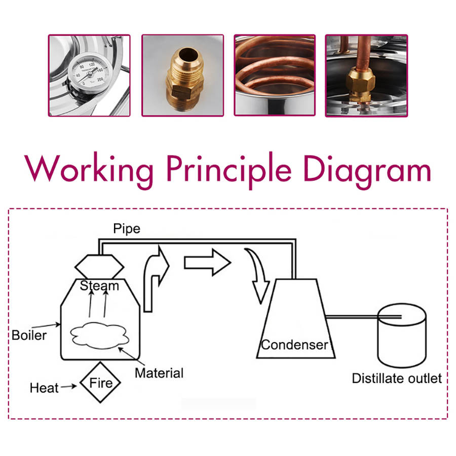 Features - This product is fabricated from copper. The design incorporates an independent airway to allow the distillate to rise faster and delivery a higher purity. This is a sophisticated and versatile piece of equipment. - This multifunctional equipment can be used for: distilling fruit liquor, distilling water, purifying water, distilling brandy, and refining plant extracts for medicinal purposes.