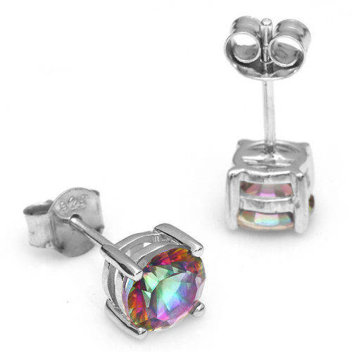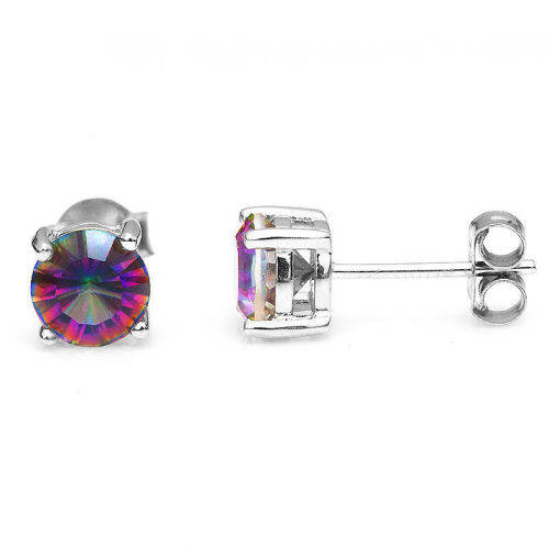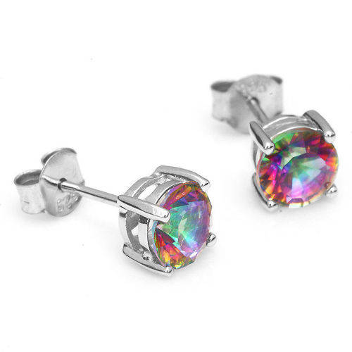 Beautiful natural Mystic Topaz 1.6Ct round stud earrings set in platinum plated .925 sterling silver.