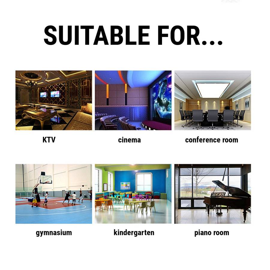 Widely used in recording studio, cinema, drum room, piano room, rehearsal room, karaoke room and bars/pubs/clubs, etc