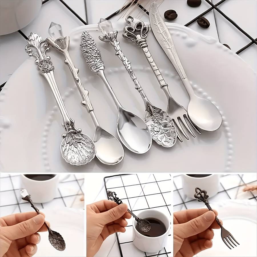6pcs set of retro royal style dessert tableware, stainless steel with Golden carvings, small sp Random Color Random style Material:Metal Item ID:GY1119274