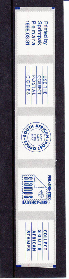 SACC 1094-1098: This is the first self-adhesive coils printed by Sprintpak with Setting I (thick adverts on back of strip). The strip consists of 5 x standard value stamps (currently R2.65). Please contact me if any further information is required. You will receive the item shown in the images.