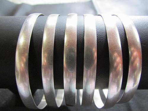 6x 6mm wide Sterling silver bangles as one lot. They are all 6mm wide and measure 65mm in diameter. Fiv re stamped 925 and the other one is stamped SILVER. A nice collection. Postage R35.00.