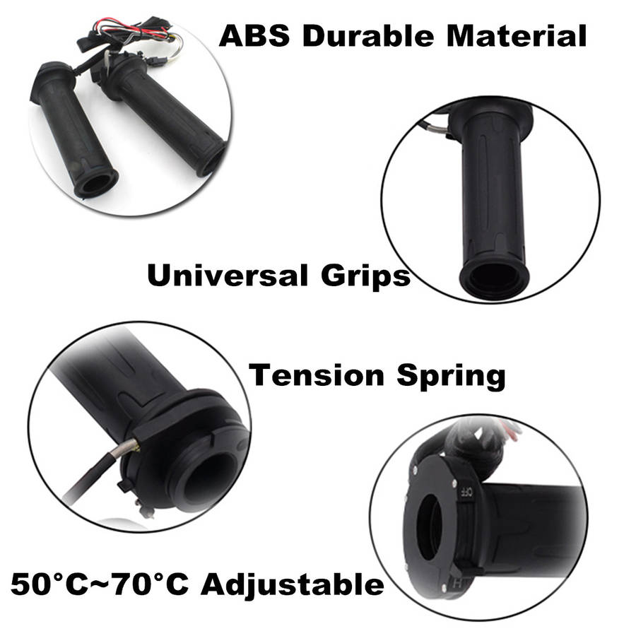 Description: Fast to warm-up Soft Ultra Grippy Rubber Rainproof switch- adjustable temperature control Incremental heat adjuster to find the heat just right for you Advanced electronic thermostat system does not consume power, helps to protect the battery Universal Fit: Suitable for All Motorcycle, Cross bike, scooters with 7/8" handlebars