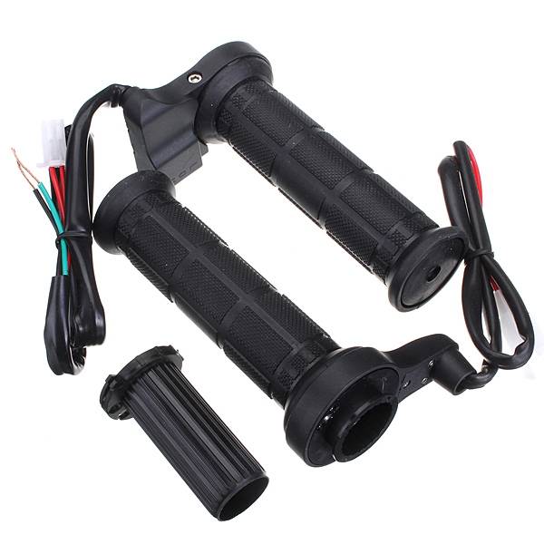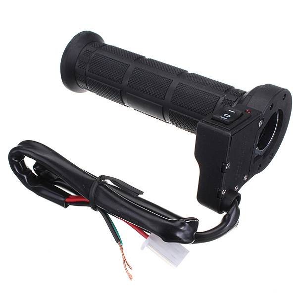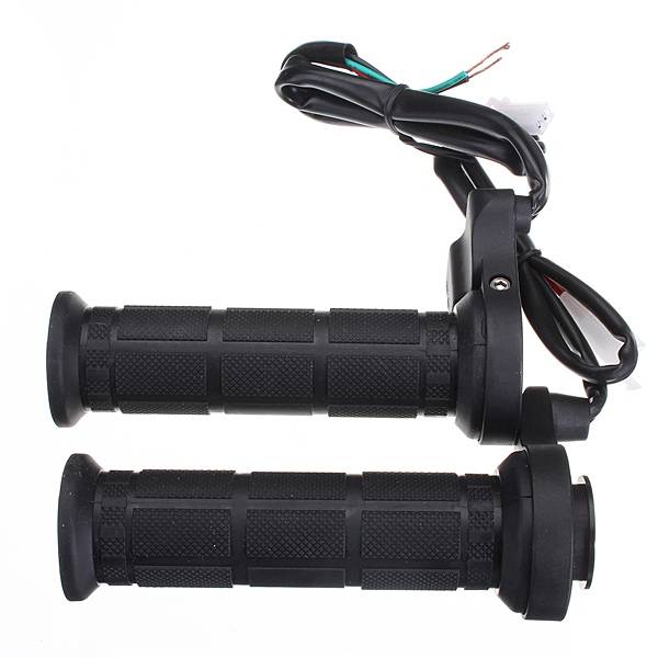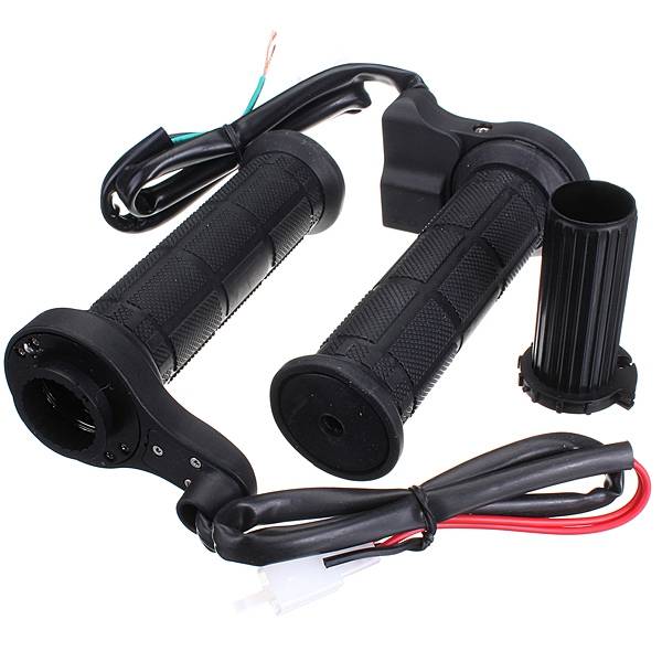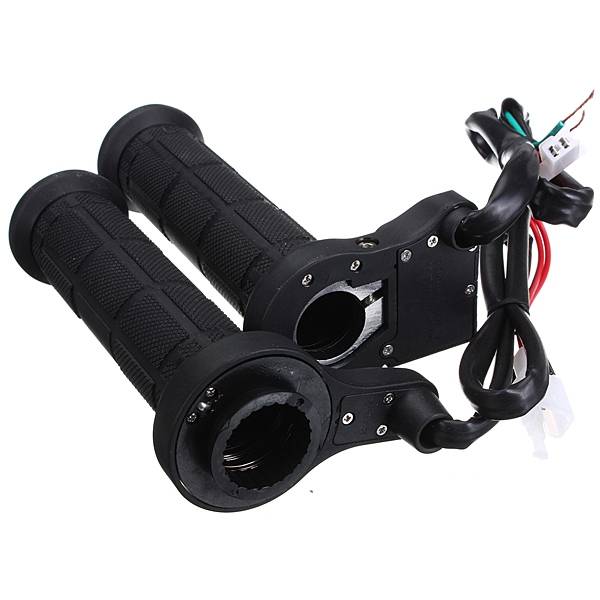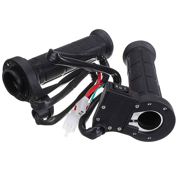 Handle with a switch to the left, aluminum ring screw is adjustable; right handle with accelerator ring.