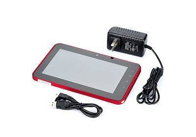 7" Capacitive Touch Screen Android 2.3 Cortex A9 Tablet PC - White + Red • 7" LCD (800x480 pixel resolution) • Nand Fast Flash 4GB, support TF card up to 32GB • Built-in 1.3MP front camera Detail Specifications Color: White + red Operating System: Android 2.3 Processor: Amlogic Cortex A9 1GHz Memory: 512MB Capacity: Nand Fast Flash 4GB, support TF card up to 32GB Display: 7" LCD (800x480 pixel resolution) Touch Control: Capacitive touch screen (gravity sensor) Video Formats: MP4/AVI/MKV/3GP/RMVB/RM (up to 1080P) Audio Formats: MP3/WMA/AAC/WAV Picture Formats: JPEG/GIF E-Book Formats: PDF/TXT Network: 802.11 b/g/n Wi-Fi Camera: Built-in 1.3MP front camera Microphone: Built-in Speaker: 1 speaker Slots: 1 x TF card 2 x USB (HOST/DEV) 1 x HDMI 1 x DC 1 x 3.5mm earphone Function: E-Book, word, excel, Power point, Gmail Software: Web browsing; Send and receive e-mail; Instant messaging software such as QQ. MSN, SKYPE VoIP, etc.; Gravity sensing game; touch game, E-book; Text processing; Video player and music; Android Market Languages: Czech/Danish/German/English/Spanish/French/Italian/Dutch/Norwegian/Polish/Portuguese/Swedish/Turkish/Greek/Russian/Korean Battery: Built-in 3000mAh rechargeable battery Accessories: 1 x 100~240V AC Power Adapter (2-flat-pin plug) 1 x USB cable (75cm) 1 x English user manual Manufacturer's Warranty: 12 Months excluding physical damages (see specifications for terms and details) Dimensions: 7.80 in x 4.72 in x 0.51 in (19.8 cm x 12.0 cm x 1.3 cm) Weight: 13.62 oz (386 g)