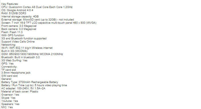 7 Inch Tablet PC Built-in Moblie Phone 3G, GPS Dual Core Dual Camera Android 4.0**In Box & Charger**