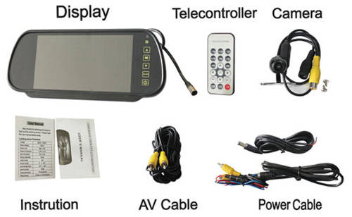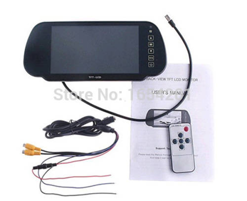7inch car mirror monitor: Screen size:7 inch, Resolution:480x272, Product Size:27.9x9.5x2.4cm(10.98x3.74x0.94 inch).View area:5m, Power Voltage:9-36V DC,Power Consumption;<=6W, Item type:Parking Assistance, Operate System:PAL/NTSC, Video Input:V1/V2.auto switch, Storage temperature:0~40 degree Celsius, Operation temperature:-20-60 degree Celsius , Car Make:All Car, No Audio Input or Output.