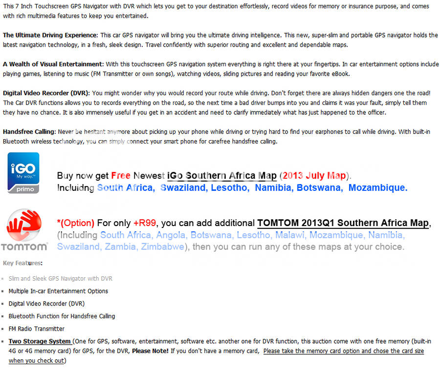 7 Inch Touchscree Car SatNav Blackbox DVR with iGO Southern Africa Map/Can run TomTom Map(Optional)