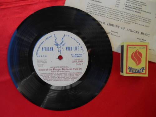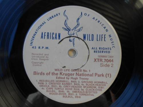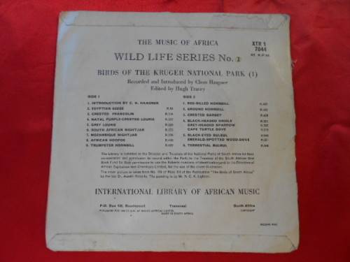 7" single vinyl record of Birds of the Kruger National Park (1) Xtr. 1 Wildlife Series No. 1 45rpm. Recorded and Introduced by Clem Haagner. International Library of African Music.
