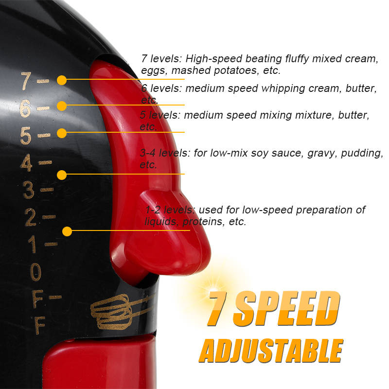 -- 7 speed settings??? ? 7 levels: High-speed beating fluffy mixed cream, eggs, mashed? ? potatoes, etc. ? 6 levels: medium speed whipping cream, butter, etc. ? 5 levels: medium speed mixing mixture, butter, etc. ? 3-4 levels: for low-mix soy sauce, gravy, pudding, etc. ? 1-2 levels: used for low-speed preparation of liquids, proteins, etc. -- Ergonomic design contour grip for ease and comfort -- Burst of Power function provides extra mixing power to work through batters and ensure even mixing at any speed -- One-touch beater eject makes clean up quick and easy -- Includes full-size chrome beaters and dough hooks