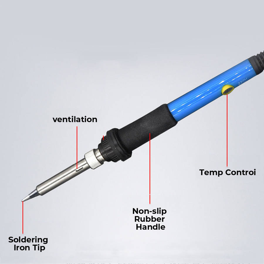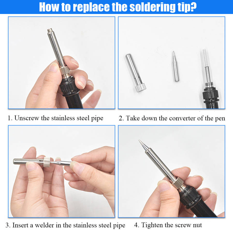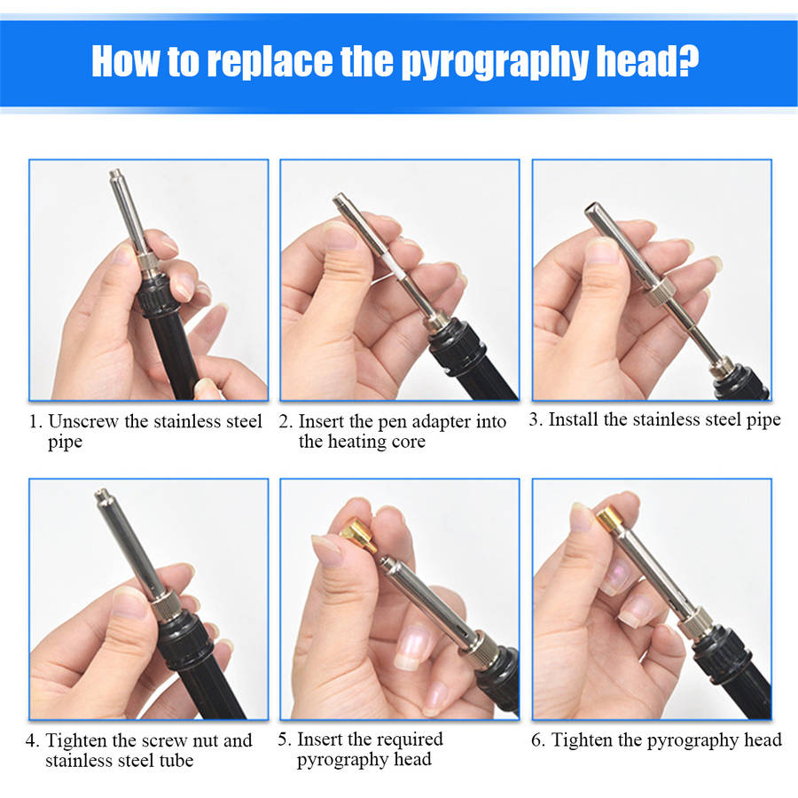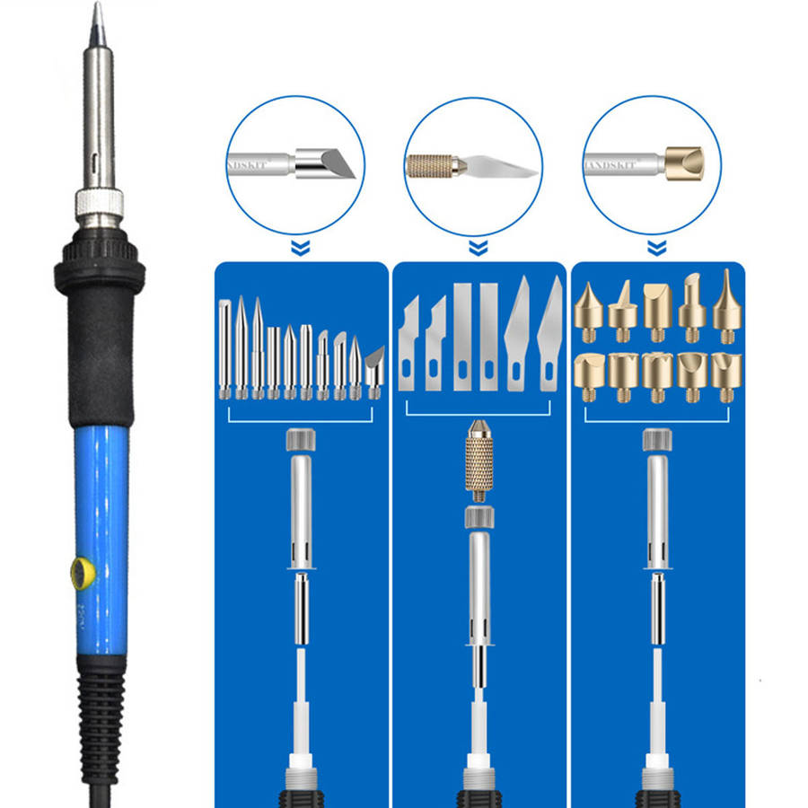 Feature: -There are many different kit combinations, you can choose the appropriate soldering iron kit according to your needs. - Imported ceramic heating core, heating quickly. Adjustable temperature range: 200-450°. -ESD design, safe and reliable when used. -Including various tools to meet different fine engineering requirements. -The project is very suitable for electric repair, home DIY and wood burning projection. Specification: Name: Pyrography Kit Output Temperature: Adjustable Output Power: 60W Quantity: 71PCS Type:US Plug/EU Plug/AU Plug Package includes: 1 x temperature adjustment soldering iron Details Pictures: