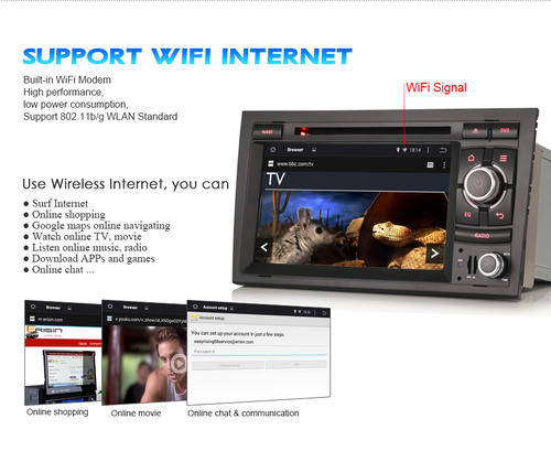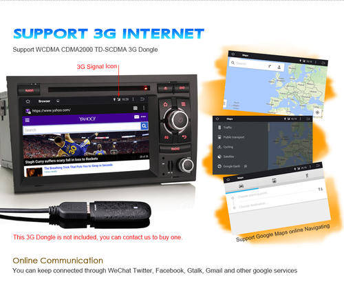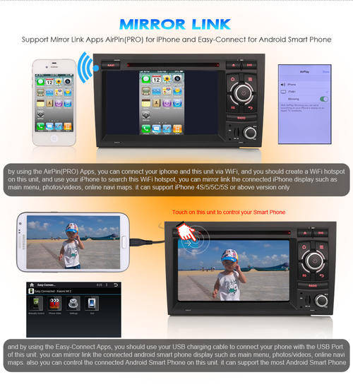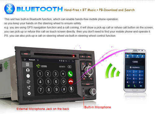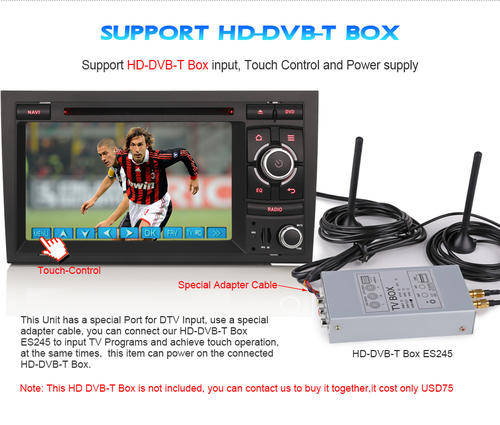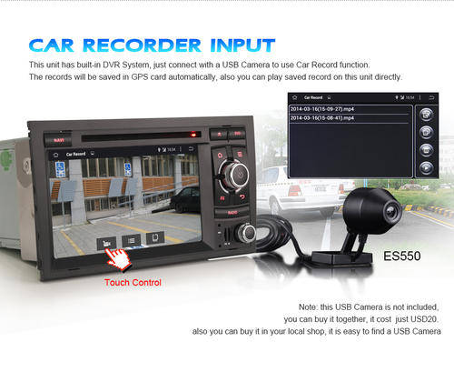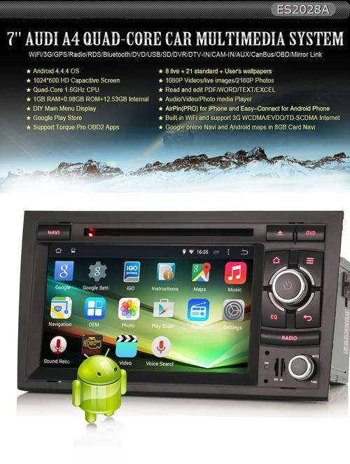 7" All-in-One Design for AUDI A4 Cars with Can-Bus-Decoder. Adopt the newest Android 4.4.4 OS, 1024*600 HD Capacitive Touch Screen, Quad Core CPU and 12.53GB Internal Storage. it has special Port for Digital TV Box, you can connect our HD-DVB-T Box ES245 to achieve touch operation, and this item can power on the connected Digital TV Box. built-in DVR System, just connect with a USB Camera to use Car Record function. the records will be saved in GPS card automatically, and you can play saved record on this unit directly. Support Mirror Link Apps AirPin(PRO) for iPhone and Easy-Connect for Android Phone. Support Torque Pro (OBD2 & Car), you can connect a ELM327 Bluetooth OBD2 Scanner Tool to use this function. most popular and strongest function: