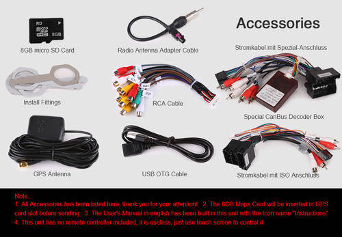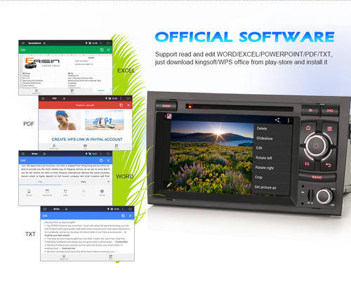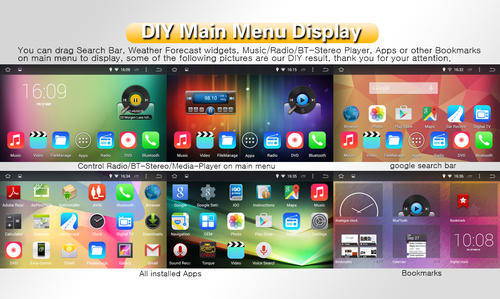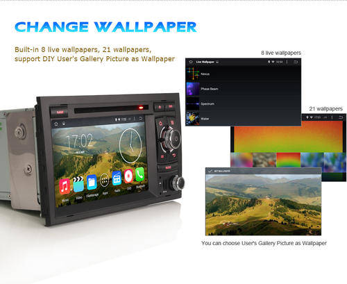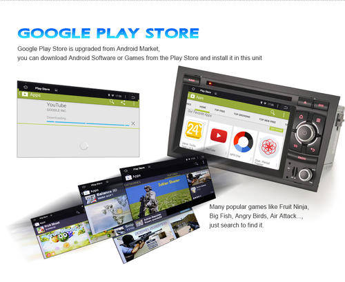 Android 4.4.4 OS, 1024*600 HD Capacitive Touch Screen, Quad-Core 1.6GHz CPU, 1GB RAM, 0.98G ROM, 12.53GB Internal Memory, support 32GB External, 1080P Videos/live images/2160P Photos, PDF/WORD/TEXT/EXCEL, Audio/Video/Photo media Player, surf Internet through 3G or WiFi, support Google online Navi and Android maps Navi, Android Maps in 8GB Card included, get access to thousands of apps, games on the Google Play Store, keep connected through Twitter, Facebook, Gtalk, Gmail, WeChat, Skype and other services, play popular games like Fruit Ninja, Feed the Candy, Angry Birds, Big Fish, Air Attack... Radio, RDS, Bluetooth, USB, SD, CAM-IN, AUX, Steering Wheel Control, Live Wallpaper, DIY Wallpaper and DIY Main Menu Display, 60 Languages, 85 Open-Unit-Logos