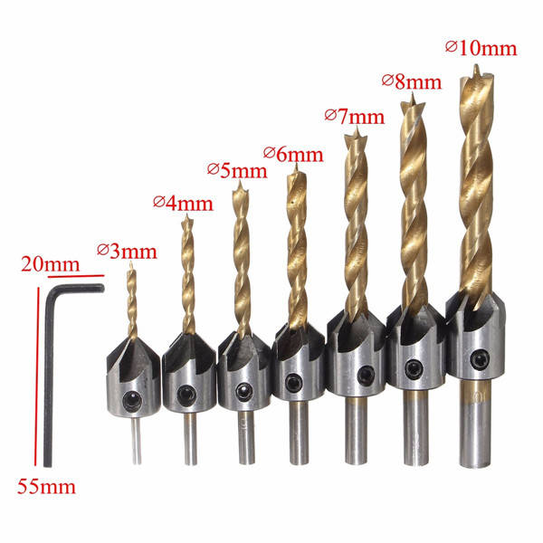 7pcs 3-10mm 5 Flute HSS Countersink Drill Bit Set Carpentry Reamer Woodworking