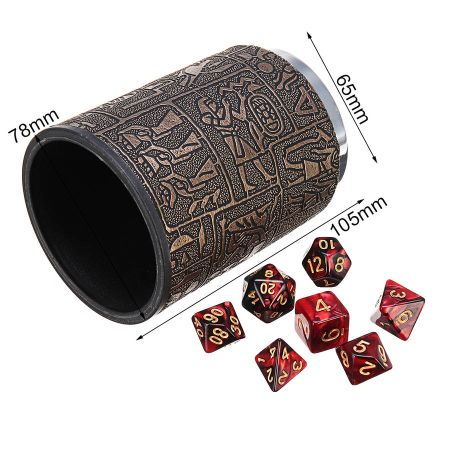 Specification: Dice Material: Acrylic Dice Cup Material: Plastic+PU Leather Surface Dice Cup Size(H*Dia):105 x 78 mm Dice Quantity: 7 Pcs Features: Good amusing dice game accessory. Each die with large and easy to read numbers. The dice styles are different and the shapes are beautiful. Made of acrylic materials which is durable and hardwearing. Dice cup with classical style, can also be used as a home decoration, improve home level. These are Double-Colors Dice.The polyhedral 7PCS set is a good accessory for Dungeons and Dragons DND MTG RPG. Package Included: 1 x Dice Cup 7 x Dice More details: