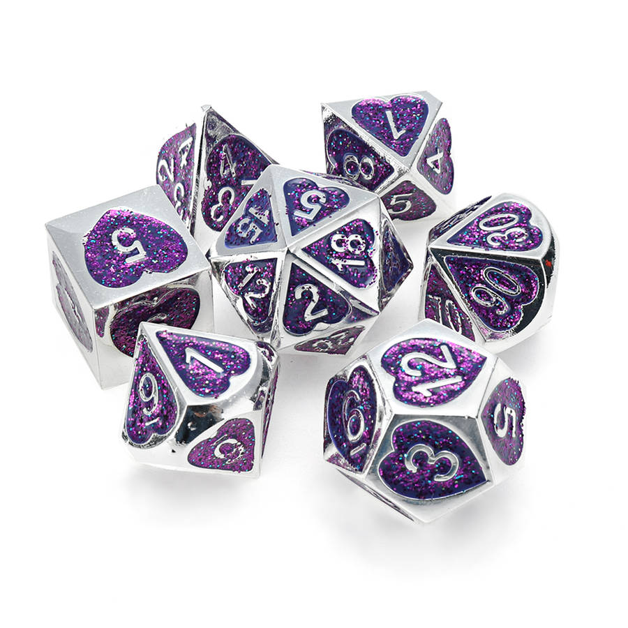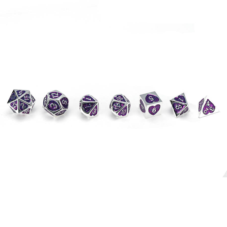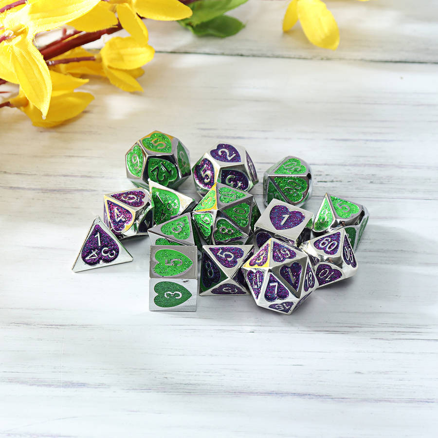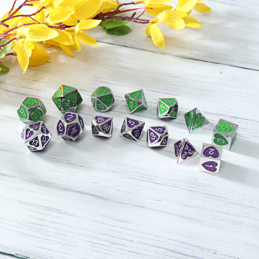 Specifications: Name: Metal Dice Set Material: Acrylic Color: Purple, Green Size: one size Quantity: 7Pcs