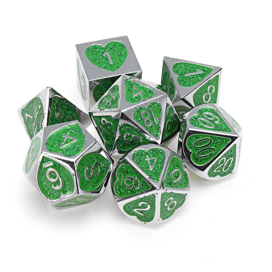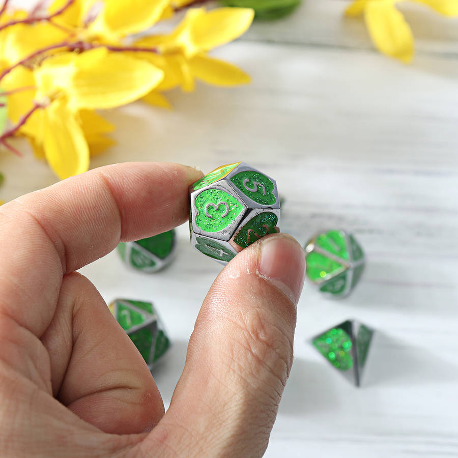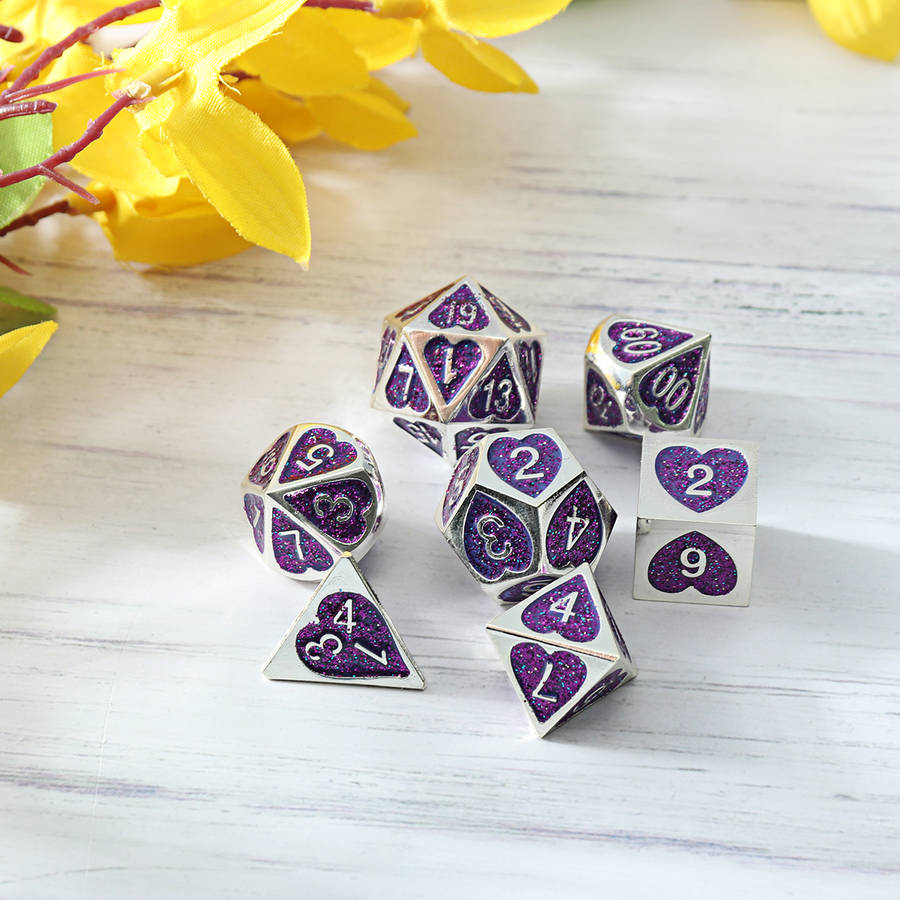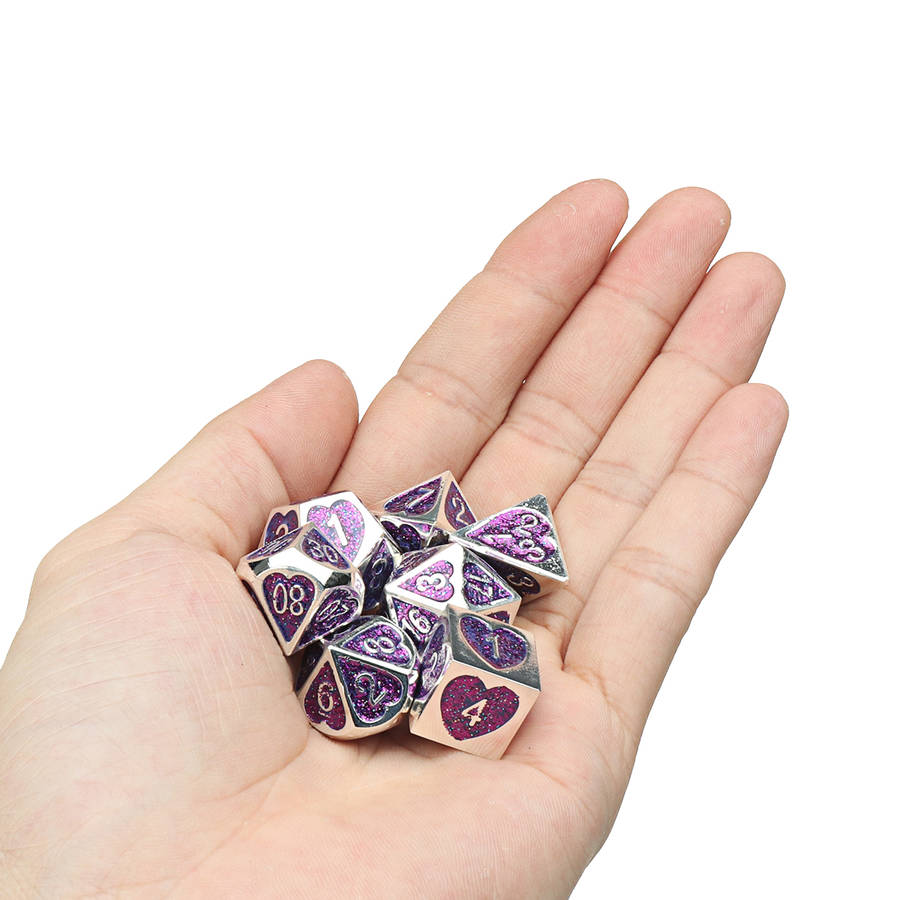 Specifications: Name: Metal Dice Set Material: Acrylic Color: Purple, Green Size: one size Quantity: 7Pcs