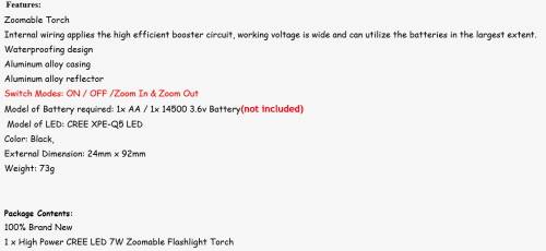 7W CREE Q5 LED 600lm Mini ZOOMABLE Flashlight Torch 14500/AA