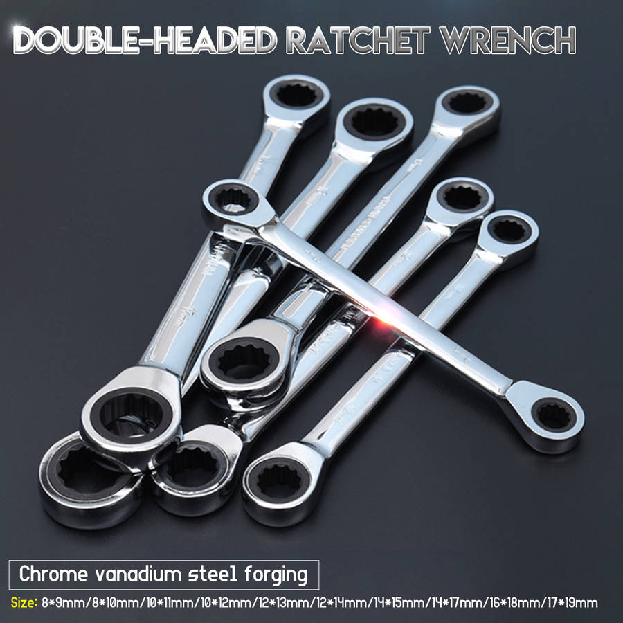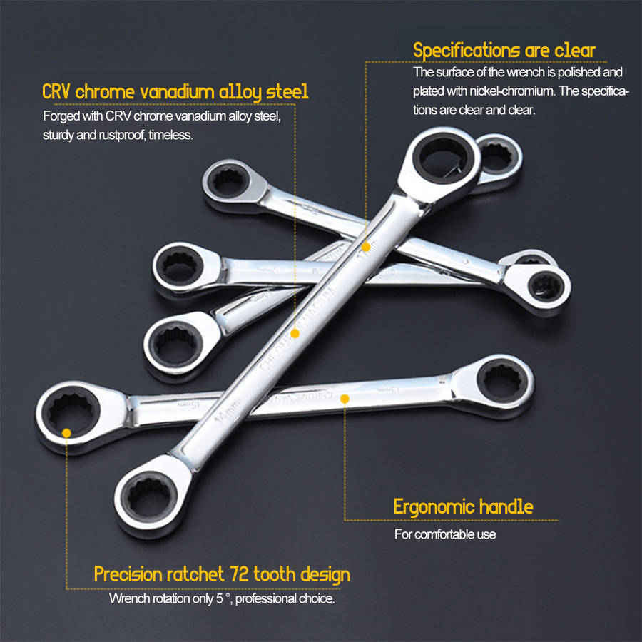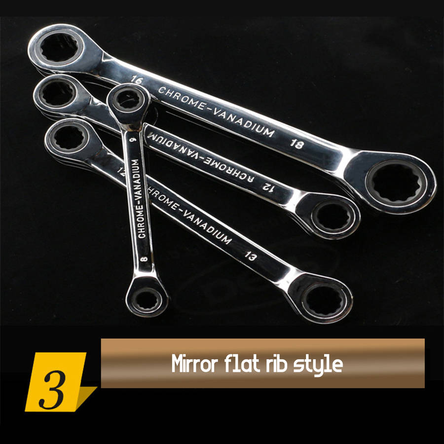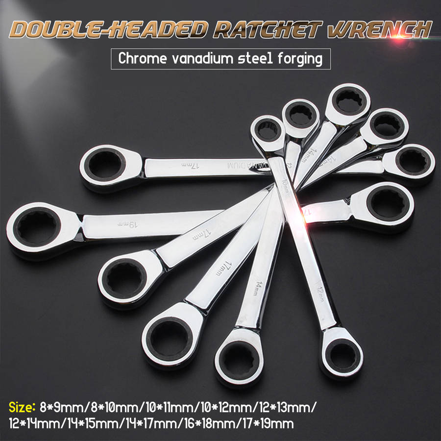 Features: - Size: A: 8 x 9mm, B: 8 x 10mm, C: 10 x 11mm, D: 10 x 12mm, E: 12 x 13mm, F: 12 x 14mm, G: 14 x 15mm, H: 14 x 17mm, I: 16 x 18mm, J: 17 x 19mm - Material: Chrome Vanadium Steel - Made from chrome vanadium, mirror polished for a fine finish, durable and long term use. - Professionally heat treated for strength and durability. - Used in factories, machinery production, vehicle maintenance and other places. - Dual end of the same size wrench, fast switching operation easier. - Built-in ratchet system, easy to operate, facilitate the complex mechanical internal operations with limited space.