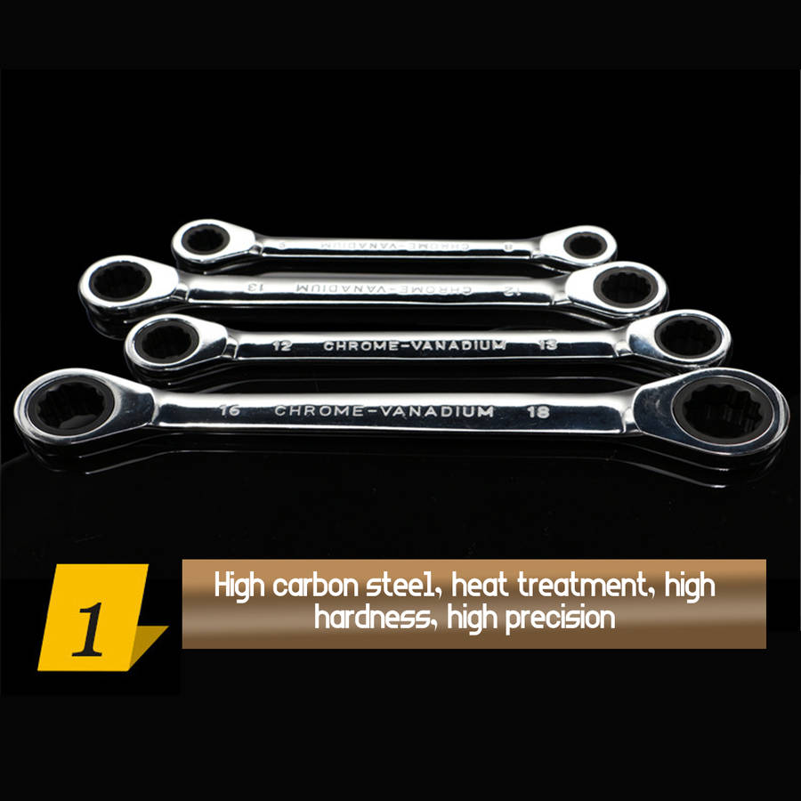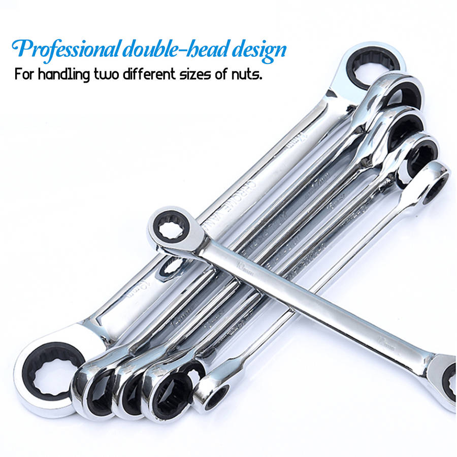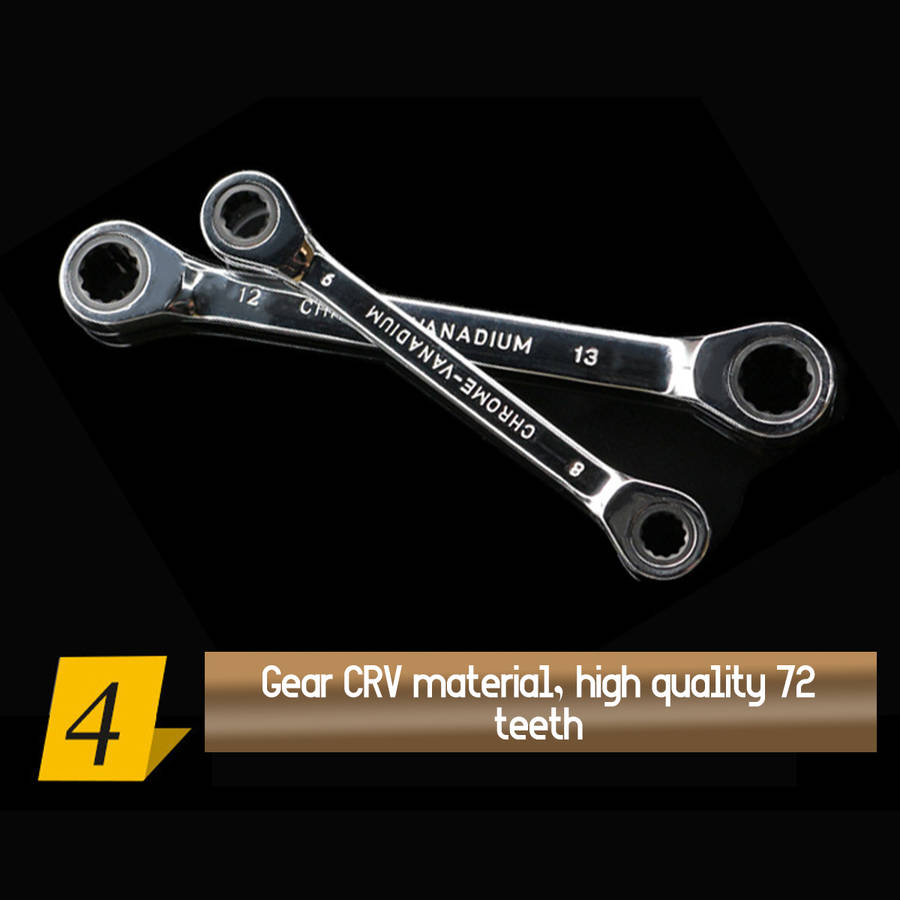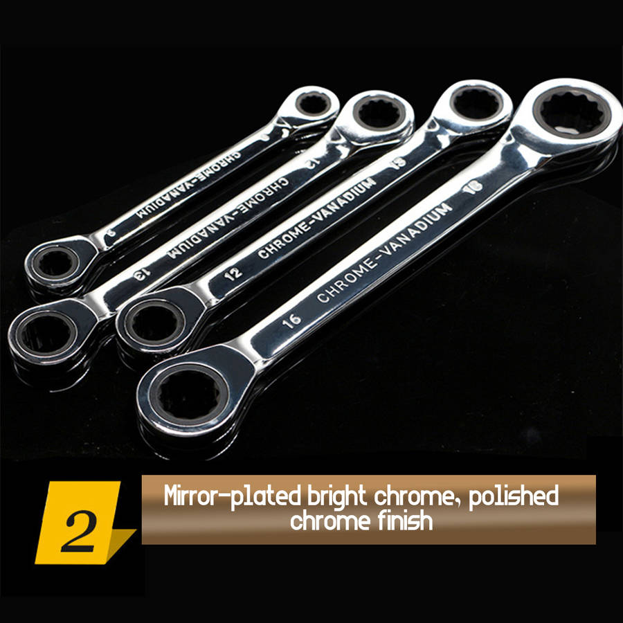 Features: - Size: A: 8 x 9mm, B: 8 x 10mm, C: 10 x 11mm, D: 10 x 12mm, E: 12 x 13mm, F: 12 x 14mm, G: 14 x 15mm, H: 14 x 17mm, I: 16 x 18mm, J: 17 x 19mm - Material: Chrome Vanadium Steel - Made from chrome vanadium, mirror polished for a fine finish, durable and long term use. - Professionally heat treated for strength and durability. - Used in factories, machinery production, vehicle maintenance and other places. - Dual end of the same size wrench, fast switching operation easier. - Built-in ratchet system, easy to operate, facilitate the complex mechanical internal operations with limited space.