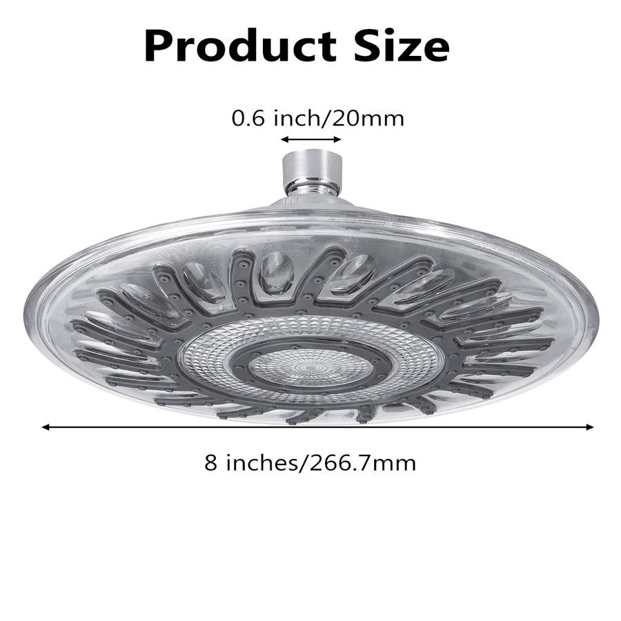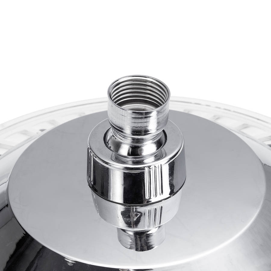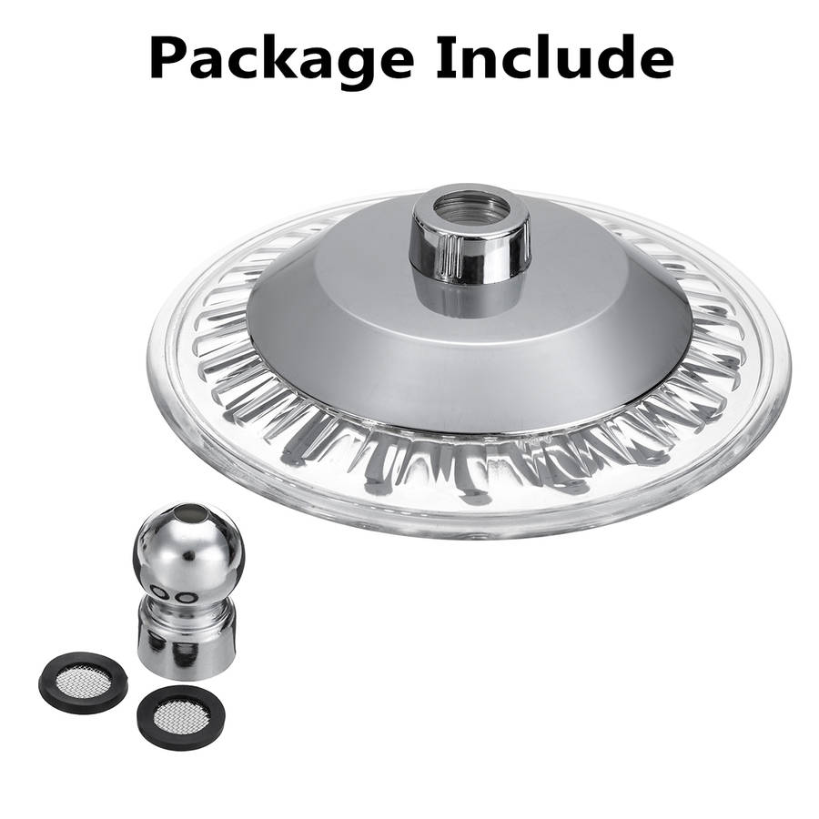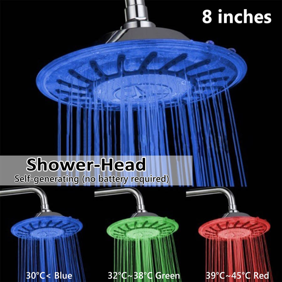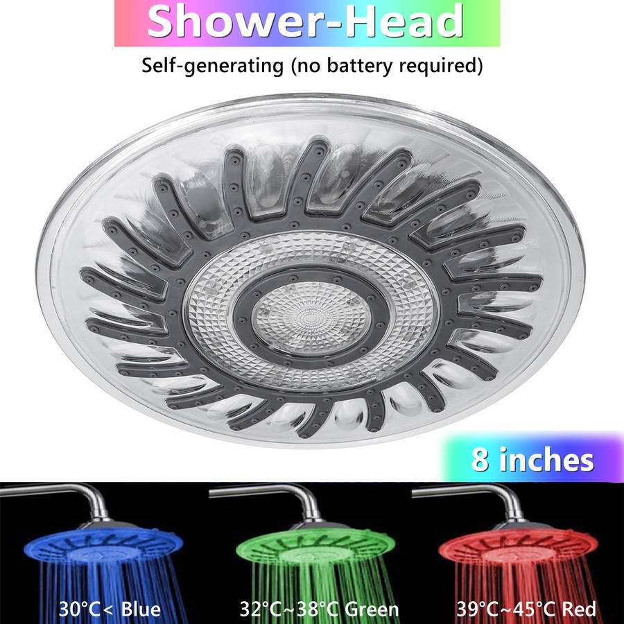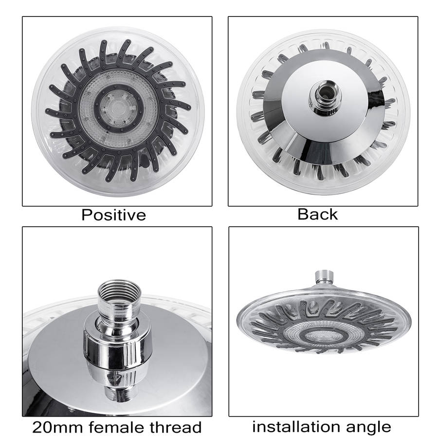 Description: - No batteries and external power supply, it will illuminate after water flows down. - Temperature control three colors: change color with temperature change, cold water, warm water, hot water show different colors respectively. - Round shaped shower head, modern and elegant. - Perfect for bathroom, to make it more fantastic. - Fits all standard connector, easy installation. - LED Shower Head only, other accessories demo in the picture is not included! - When the water temperature is lower than 32 degrees, it can be converted to blue freely, when the water temperature is 32--38 degrees, it displays green, and when the water temperature is 39-45 degrees, it displays red. Specifications: Item Name: LED Shower Head Working Temperature: 0-80ᆪ Material: ABS Interface size: 20mm internal thread (Universal Interface) Product size: length 200mm width 200mm thickness 15mm Shell Color: Silver LED Emitting Color: 3 Colors Quantity: 1 Pcs Energy supply: self-generating (No battery required) Package Include: 1 x LED Shower Head