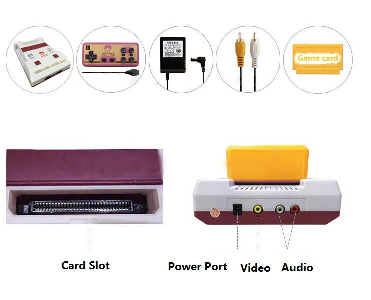 1 x D99 Game Console 2 x Game Controller 1 x Game Card (Randomly send as gift.) 1 x Audio/Video Cable for TV 1 x Power Plug